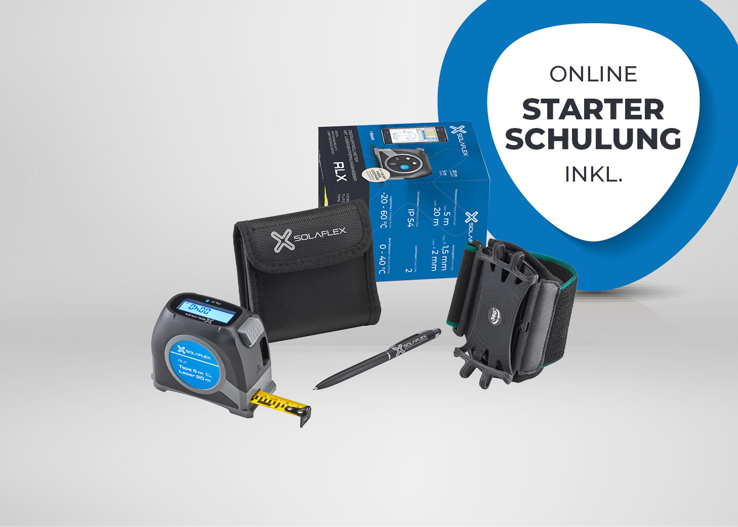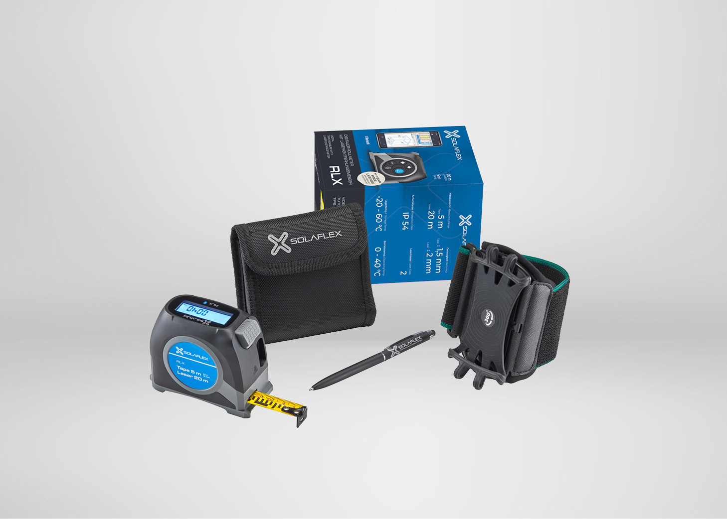 Digitaler Rollmeter und Laser-Entfernungsmesser in einem Gerät mit praktischem Zubehör.